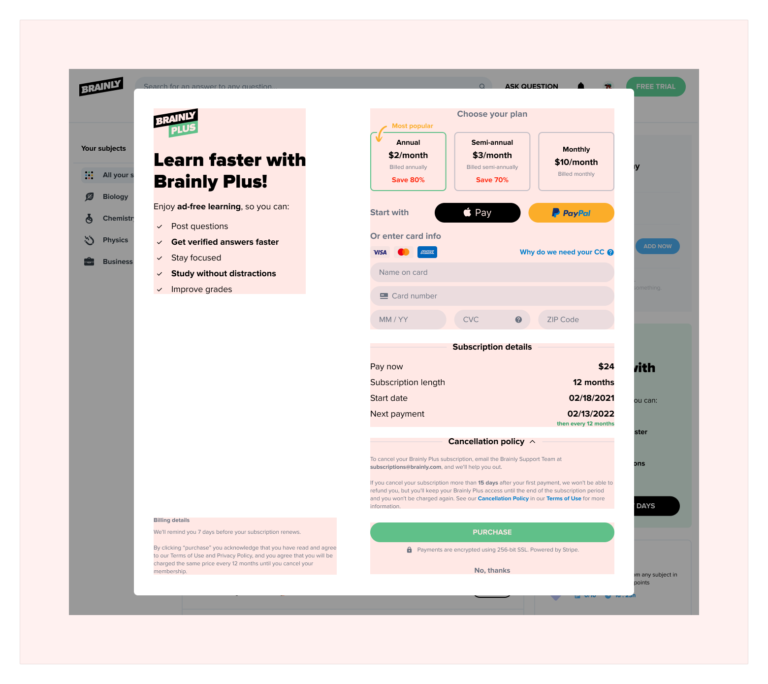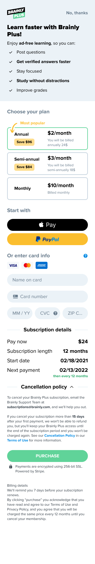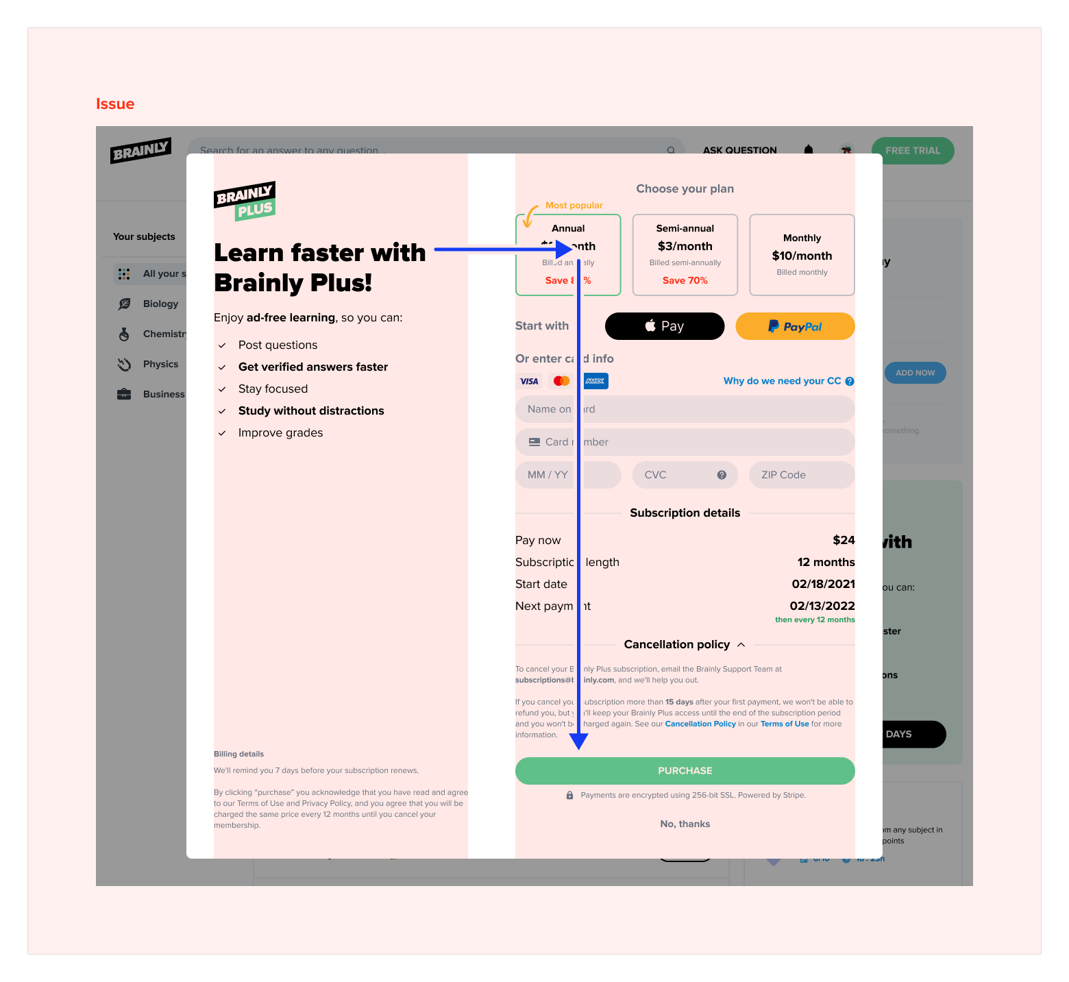 After going through the whole purchase journey, the user has to click the Purchase button to finish it. The position of the “No, thanks” button might cause him to rethink his idea about buying the selected plan.