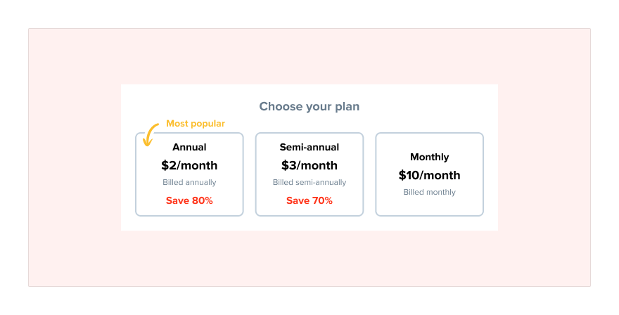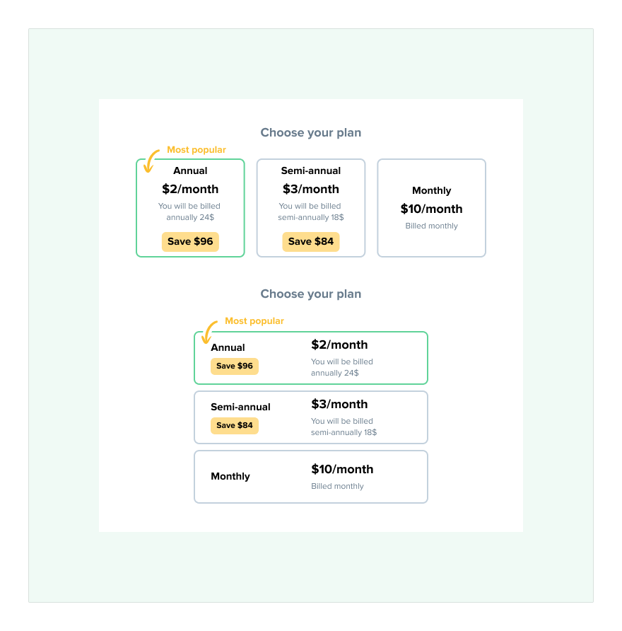 All plan boxes represent the plan's monthly cost, but for the Annual and Semi-annual, it’s not the final amount that the user will pay instantly after purchase.
