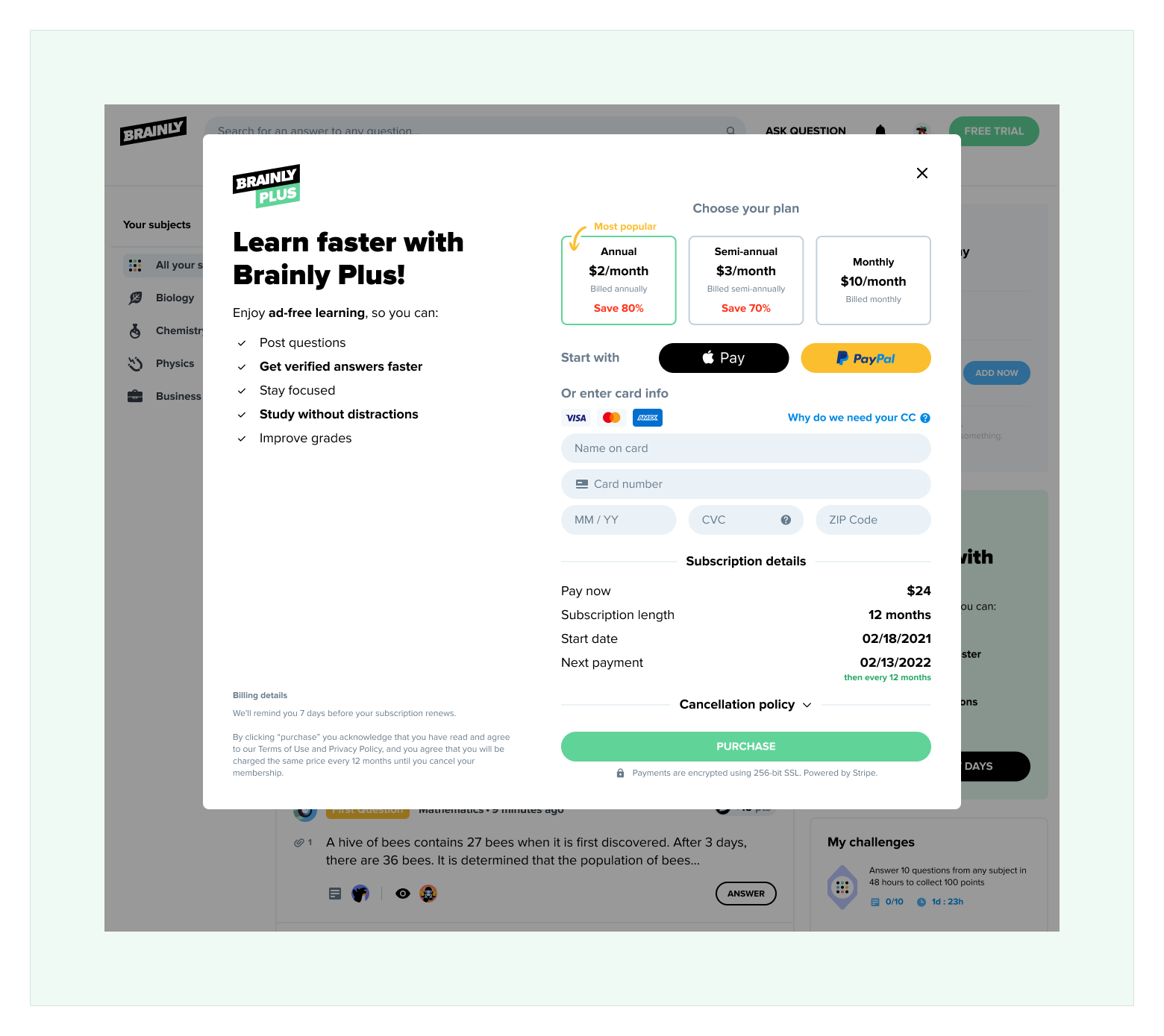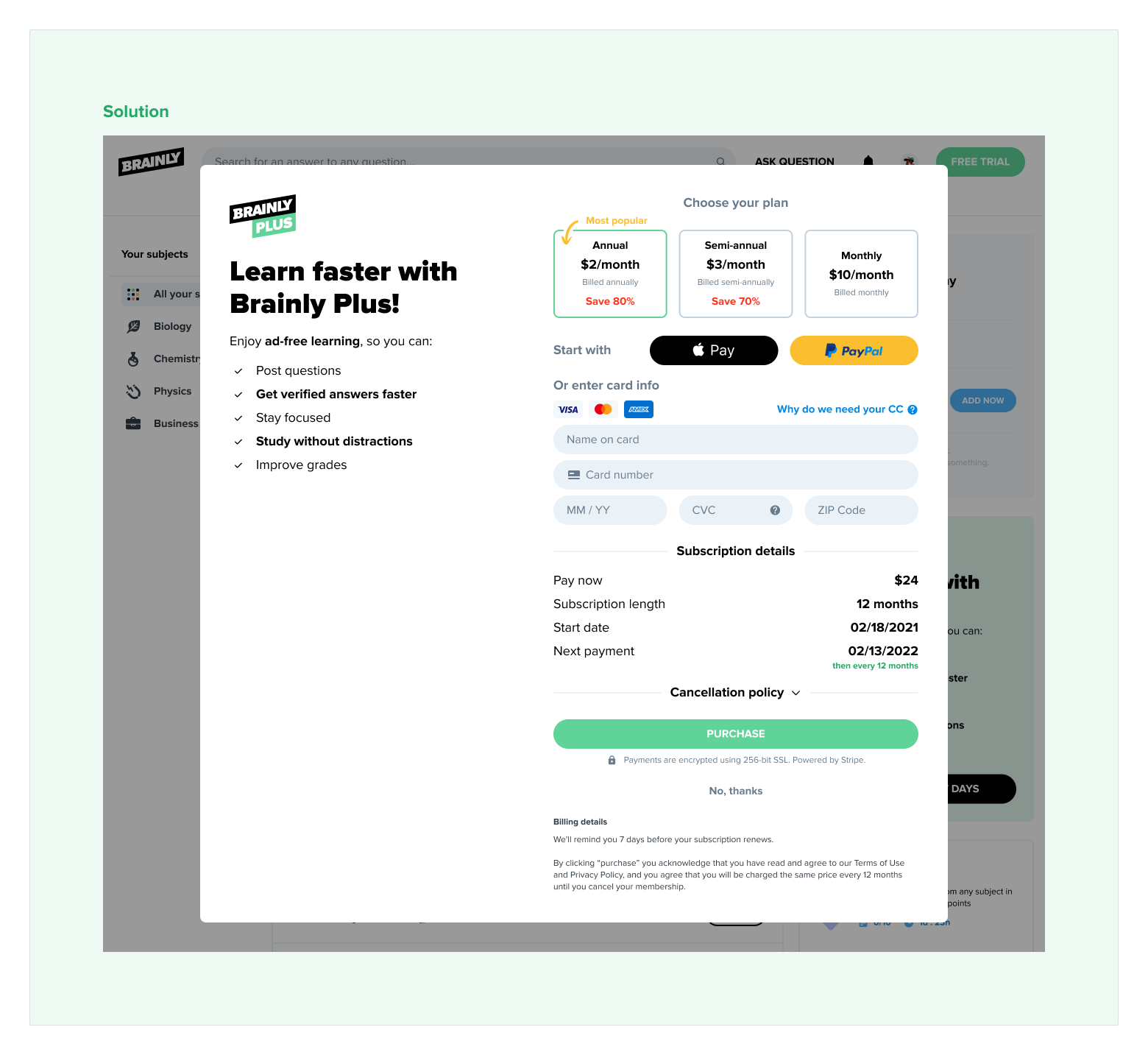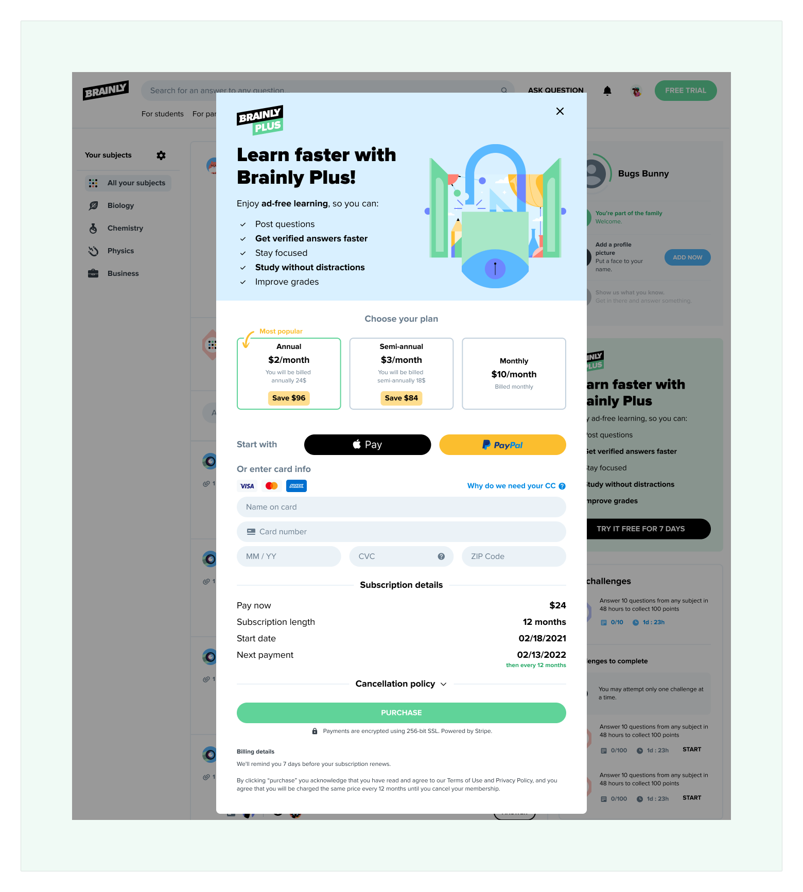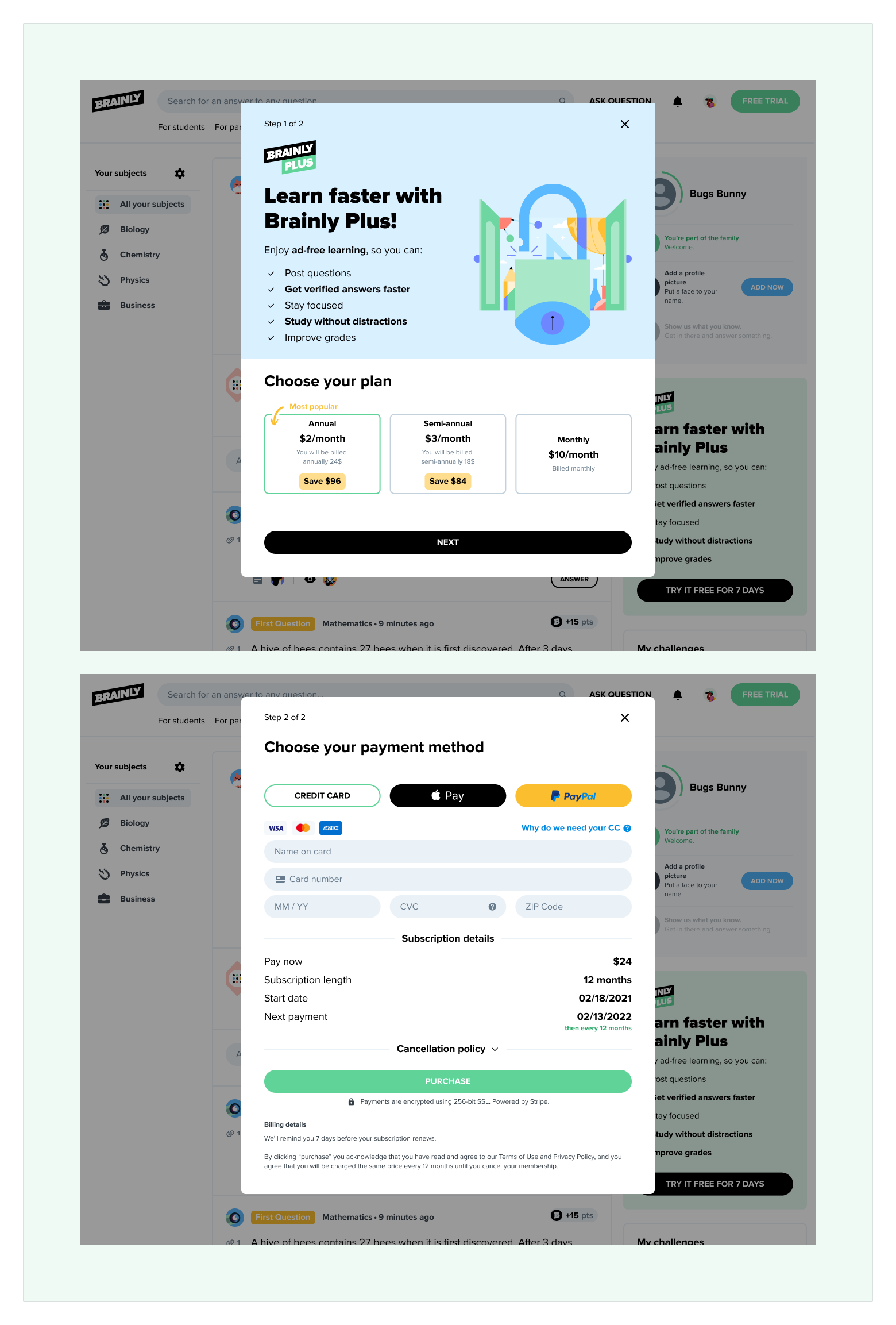 To increase focus on the plan and payment method, we can introduce 2 step process. On the first screen, the user can choose the plan, and on the second one, he can finalize the purchase.