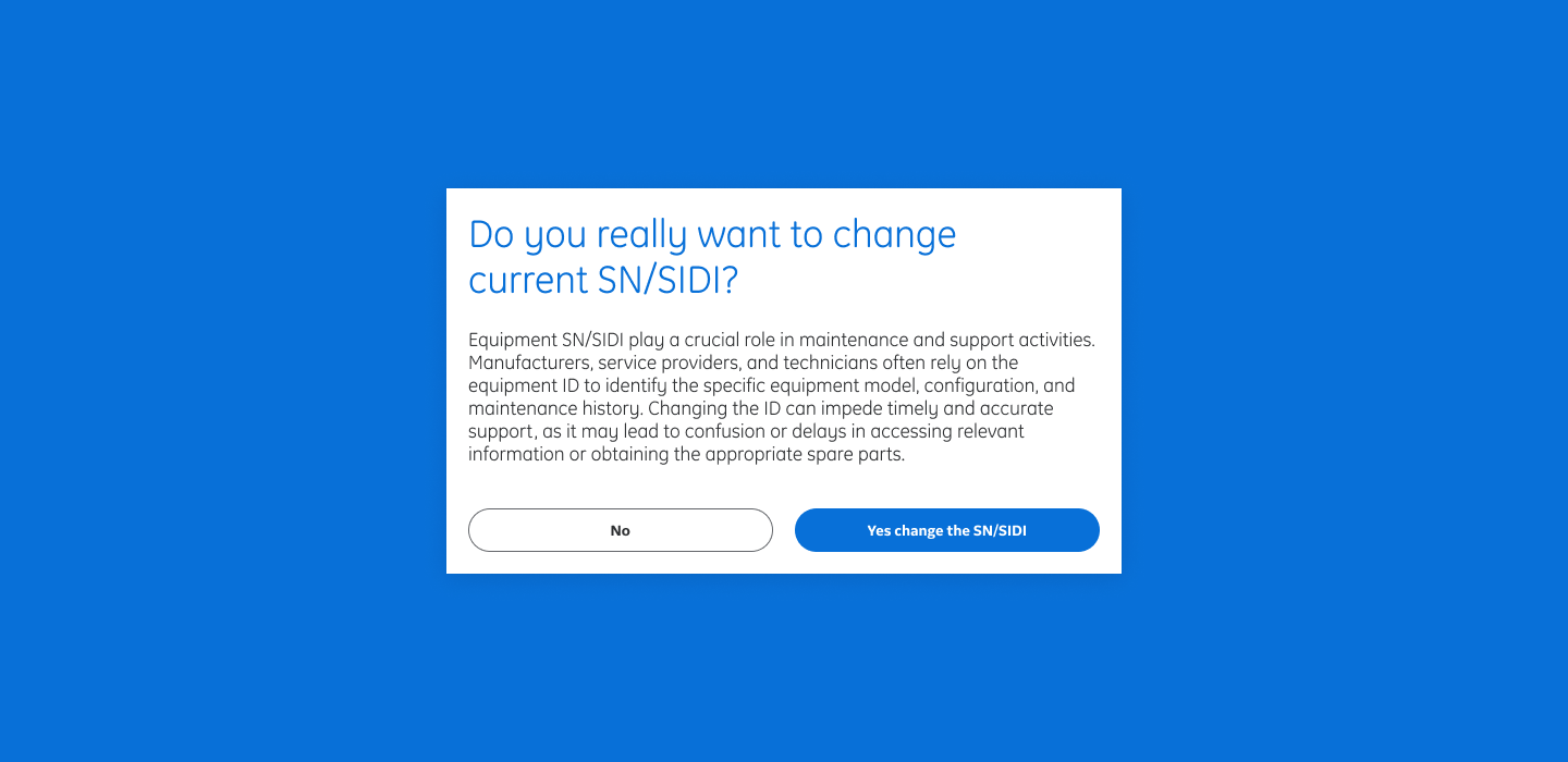 To change their SN/SIDI number, the user can click the "Change SN/SIDI" CTA located in the input. Upon doing so, a popup notification will warn the user about the risks of entering an incorrect number.
